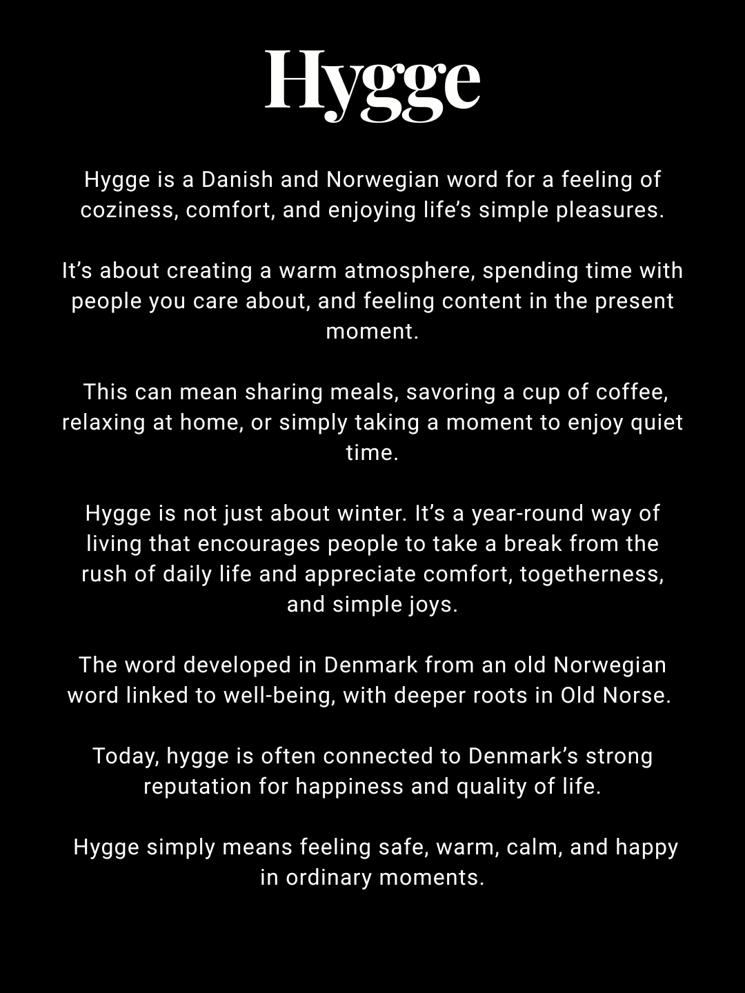 Hygge is a Danish and Norwegian word for a feeling of coziness, comfort, and enjoying life’s simple pleasures.