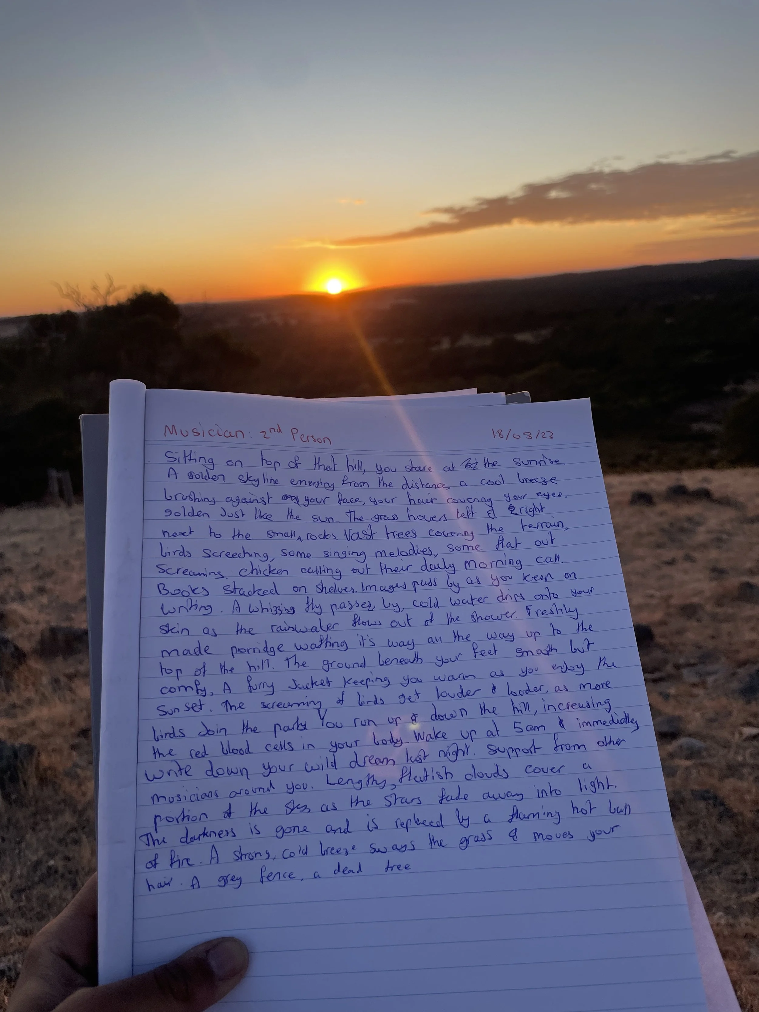 “Sitting on top of the hill, you stare at the sunrise. A golden skyline emerging from the distance. A cool breeze brushing against your face, your hair covering your eyes, golden just like the sun. The grass hooves left and right, next to the small rocks. Vast trees covering the terrain, birds screeching. some singing melodies, some flat out screaming. Chicken calling out their daily morning call. Books stacked on shelves, images pass by as you keep on writing. A whizzing fly passes by, cold water drips onto your skin as the rainwater flows out of the shower. Freshly made porridge wafting its way all the way up to the top of the hill. The ground beneath your feet smooth but comfy. A furry jacket keeping you warm as you enjoy the sunset. The screaming of birds get louder and louder, as more birds join the party. You run up and down the hill, increasing the red blood cells in your body. Wake up at 5 am and immediately write down your wild dream last night. Support from other musicians around you. Lengthy, flattish clouds cover a portion of the sky, as the stars fade away into light. The darkness is gone and is replaced by a flaming hot ball of fire. A strong, cold breeze sways the grass and moved your hair. A grey fence, a dead tree…