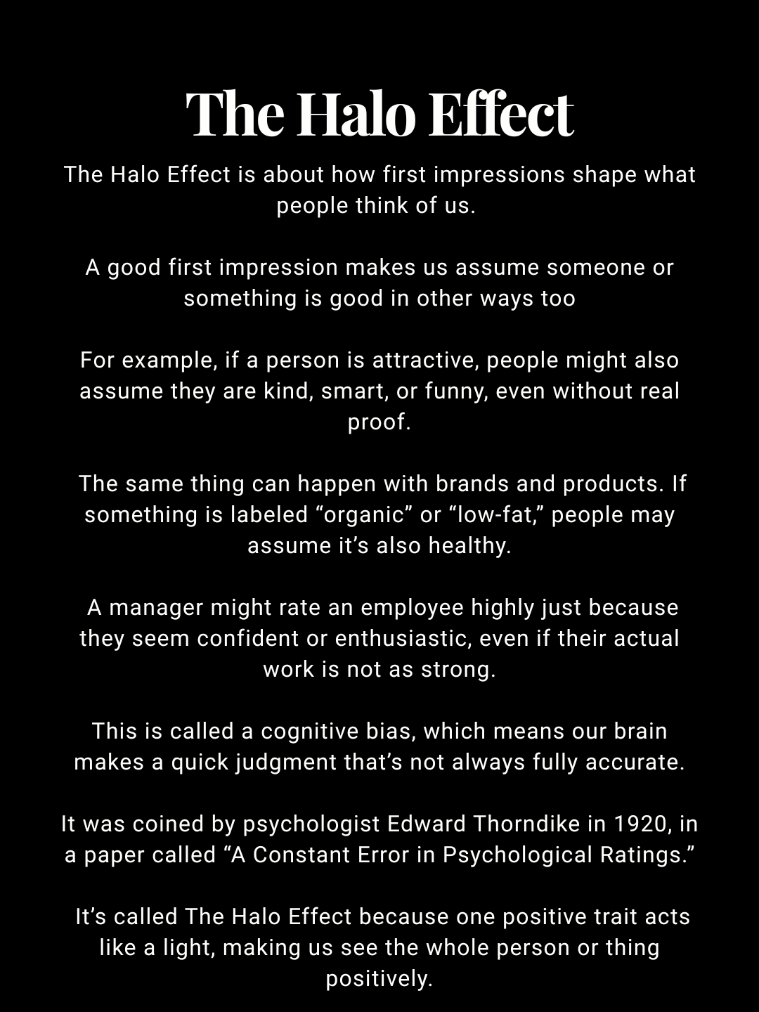 It’s called The Halo Effect because one positive trait acts like a light, making us see the whole person or thing positively.